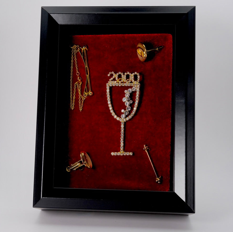 Remember the party of the year 2000. It was a grand celebration with a luxurious and sophisticated theme. The attendees adorned themselves with shiny wine glass crystal brooches with the year "2000" on top. They also wore gold cufflinks and tie pins as perfect accessories to complete their looks. The atmosphere was lively and festive, with music and dancing filling the room. It was truly an unforgettable event.