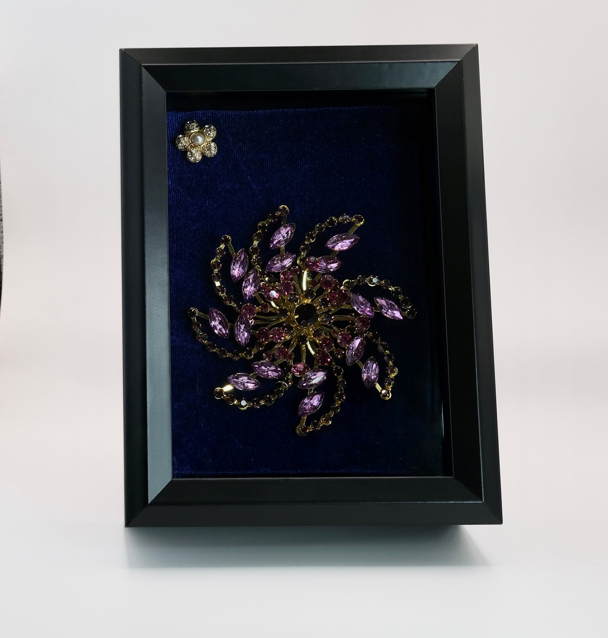 This is a vintage brooch that features a spiral design with gold tones. The brooch is adorned with purple and black stones that add a touch of elegance to its overall appearance. Additionally, the brooch has a four-leaf gold pin that is embellished with a white stone, which enhances its beauty and charm. Whether you want to accessorize your outfit for a formal event or add a vintage touch to your everyday look, this brooch will definitely make a statement.
