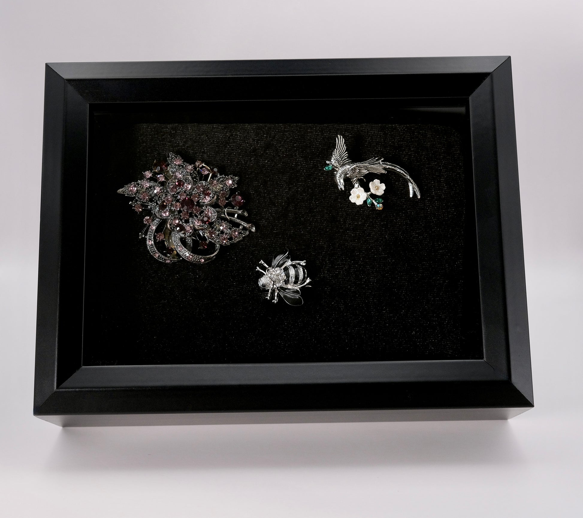 The collection boasts three stunning brooches. The first is a magnificent cluster brooch adorned with an array of striking purple stones. The second is a sterling silver dragon, intricately crafted and exquisitely detailed. Last but not least, there is the black bee, a charming and eye-catching piece that is sure to turn heads.