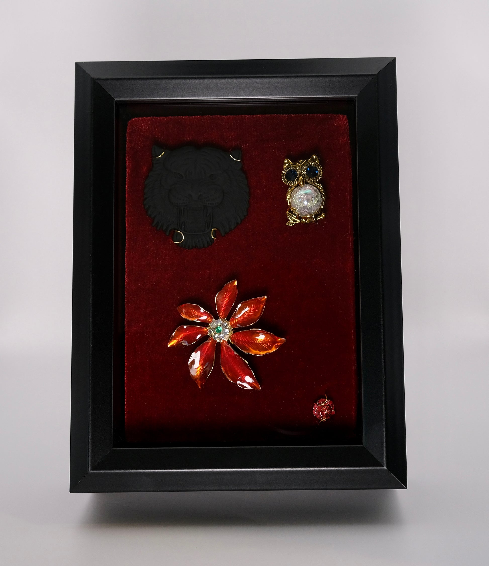 This exquisite box showcases a majestic black lion, captured in all its glory. The lion's intense power and strength are evident in its commanding presence. Alongside the lion, you'll also find a mesmerizing owl, complete with a crystal stone belly that sparkles in the light. Finally, the box is adorned with a collection of striking red flower brooches and a beautiful red flower pin, adding a touch of elegance to this already stunning piece.