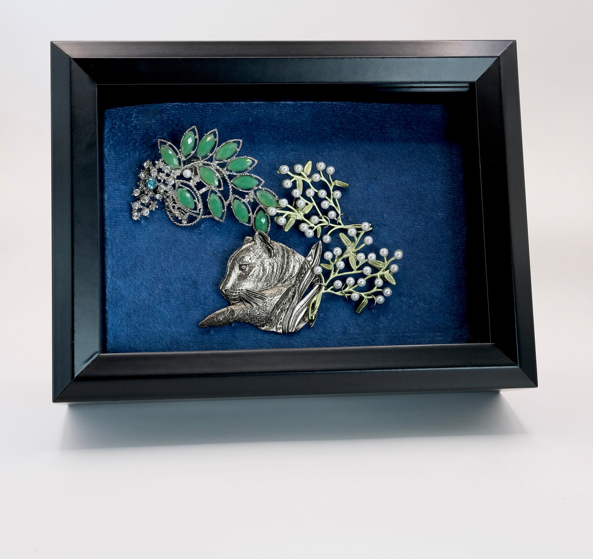 On a vibrant blue mat, you can see a magnificent sterling silver tiger brooch, a stunning sterling brooch adorned with green stones, and a pair of exquisite white stone earrings. The intricate design and exquisite craftsmanship of these jewelry pieces are sure to catch your eye and leave you in awe.