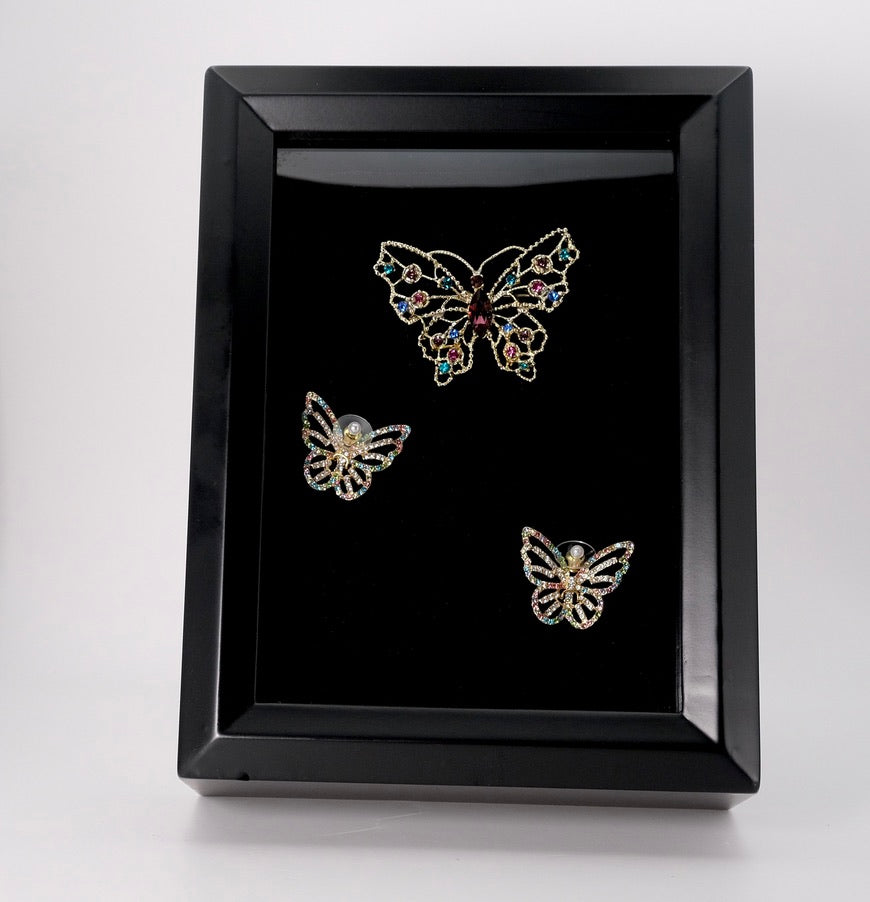 This stunning set includes a butterfly brooch with a body and large ruby-red stone wings crafted from vibrant red, blue, and green stones. The set also comes with two butterfly earrings that are decorated with shimmering stones and topped with a pristine white stone. This set is sure to make a statement and add a touch of sophistication to any outfit.
