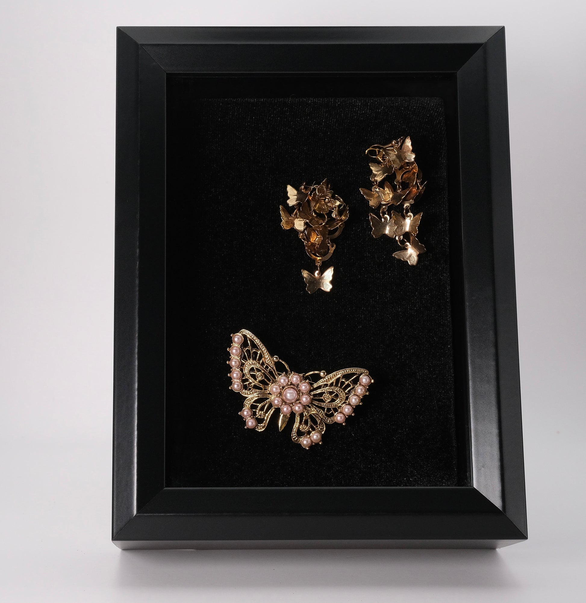 This lovely set includes a beautiful gold butterfly brooch that features a stunning white stones on the wings. The intricate details of the butterfly's wings are sure to catch the eye and add a touch of elegance to any outfit. In addition to the brooch, the set also includes a pair of gold earrings that of butterflies. These earrings hang as if flying, adding a unique and playful touch to the overall look. Whether you're looking to elevate your everyday style or add a touch of sparkle to a special occasion outfit, this set is sure to do the trick.