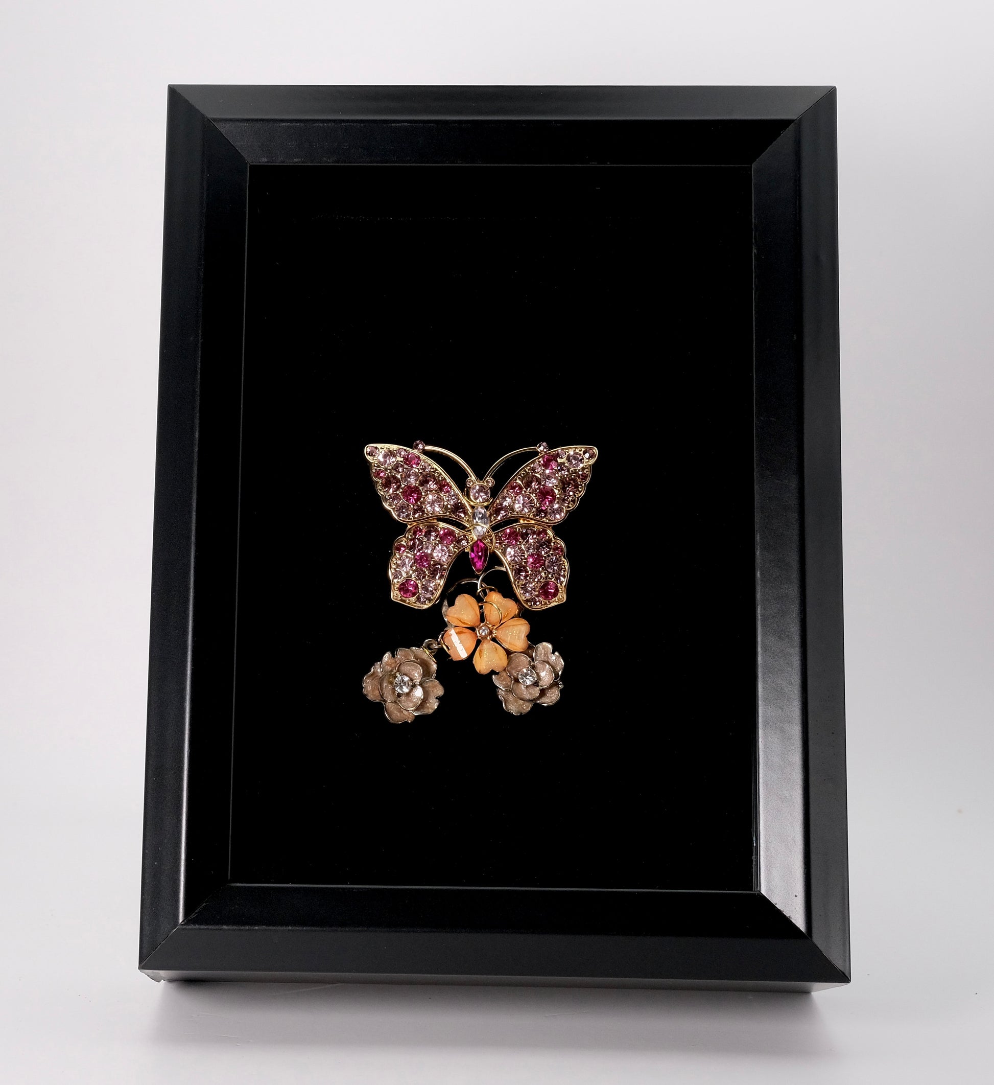 This stunning collection features an exquisite vintage Monet butterfly brooch, adorned with sparkling ruby red and crystal stones that beautifully reflect light. In addition, the collection contains an eye-catching orange flower pin, adding a pop of color to any outfit. Finally, there are two earth-stone earrings that perfectly complement the brooch and pin. Each piece is crafted with precision and care, making it a perfect addition to any jewelry collection.