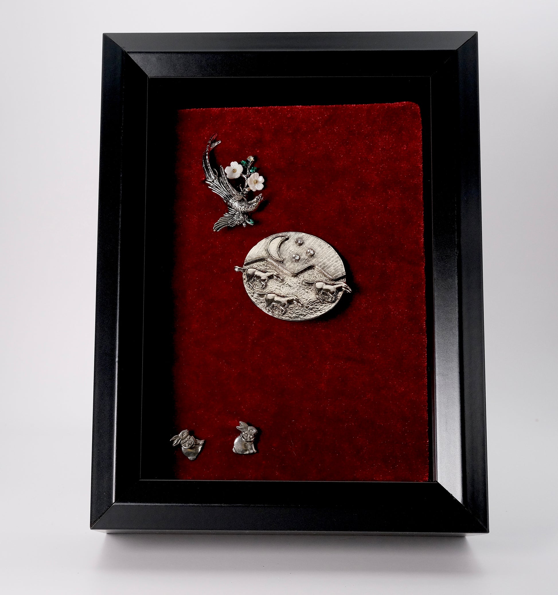 This exquisite collection features a stunning sterling silver brooch, which boasts a magnificent display of three horses galloping gracefully under a starry, moonlit sky. In addition to that, there is a charming bird of prey pin adorned with two delicate white flowers and green stone leaves, which adds a touch of natural beauty to the set. The collection also includes two intricately designed silver rabbit pins, which are sure to delight any animal lover.