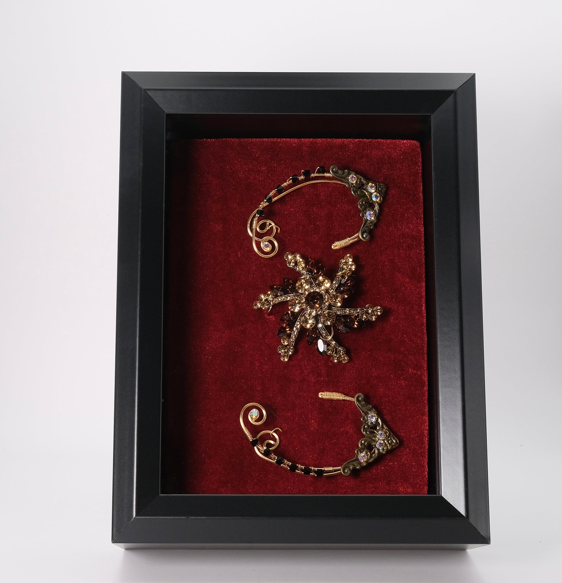The brooch features an intricate design with gold tone, topaz, and white crystals, which add a touch of elegance to the overall look. The ear piece is also a work of art, covering the entire ear with a unique and eye-catching design. This piece is perfect for someone who wants to make a statement and stand out from the crowd. Its exquisite design and attention to detail make it a true work of art.