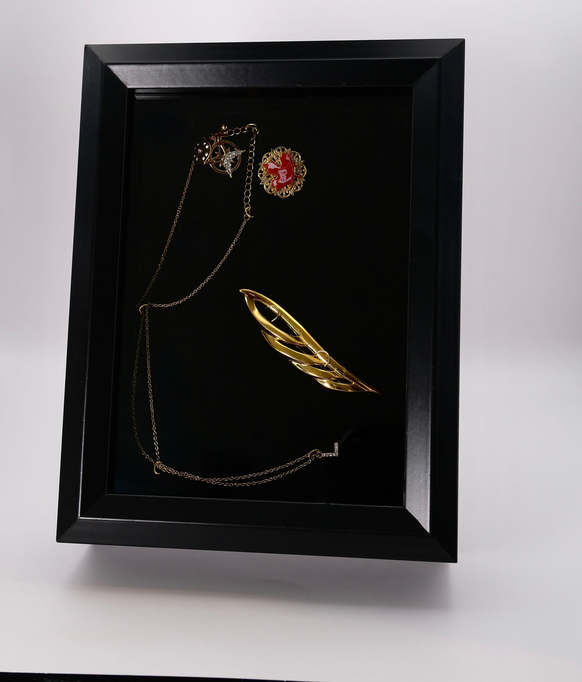 This stunning accessory features a luxurious gold chain adorned with eye-catching "L" stones, elegantly placed on a sleek black stain. Along with beautiful maple leaf pen that is further embellished with a delicate gold feather brooch. This exquisite piece is sure to add a touch of sophistication and style to any outfit.