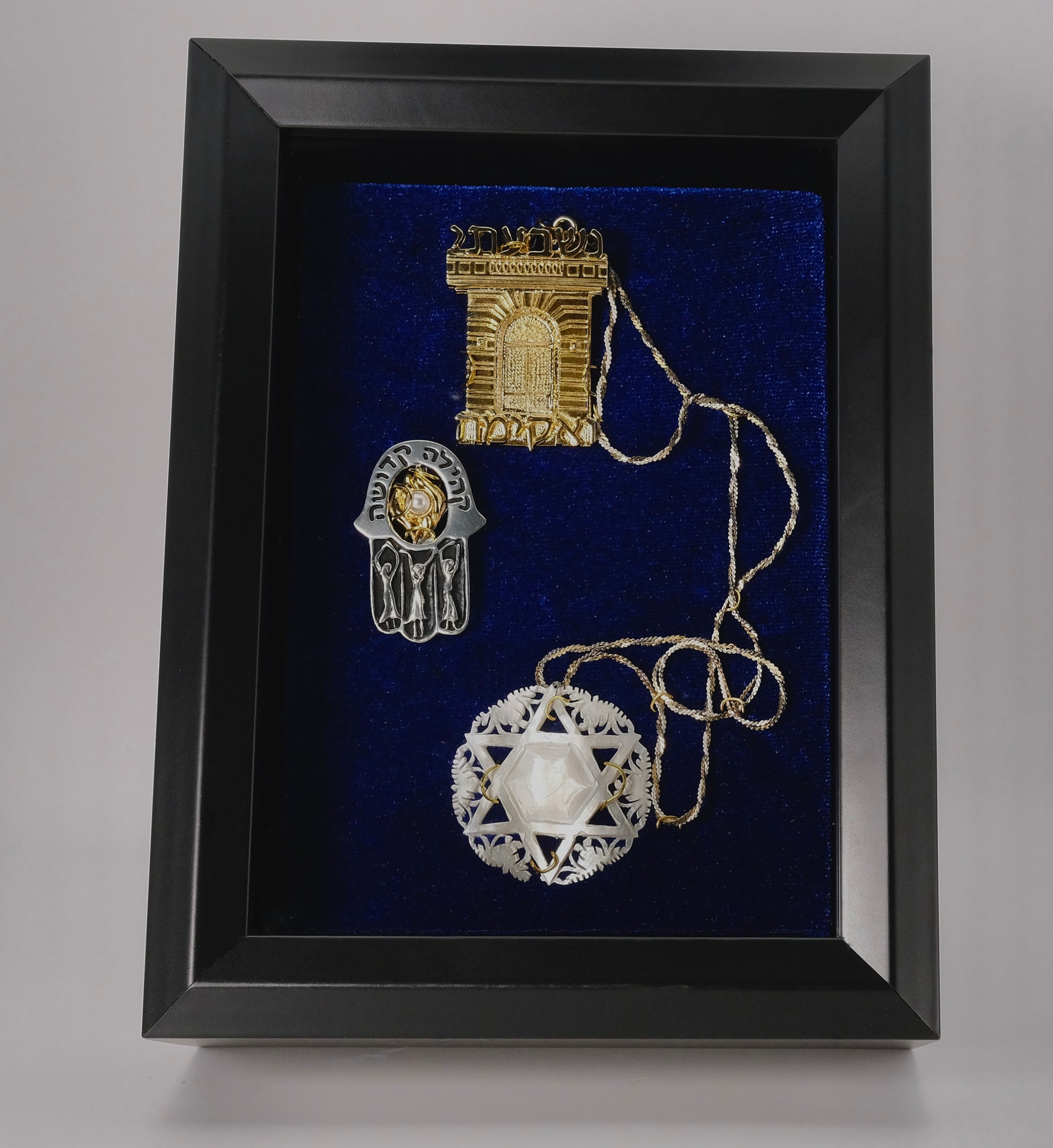 Elevate your style with this stunning brooch set featuring three women adorned with a lustrous pearl, nestled in a delicate golden flower brooch. A beautiful Star of David necklace hangs from a gleaming gold chain, while the second brooch boasts intricate Doors and Temple details, exuding sophistication and elegance.